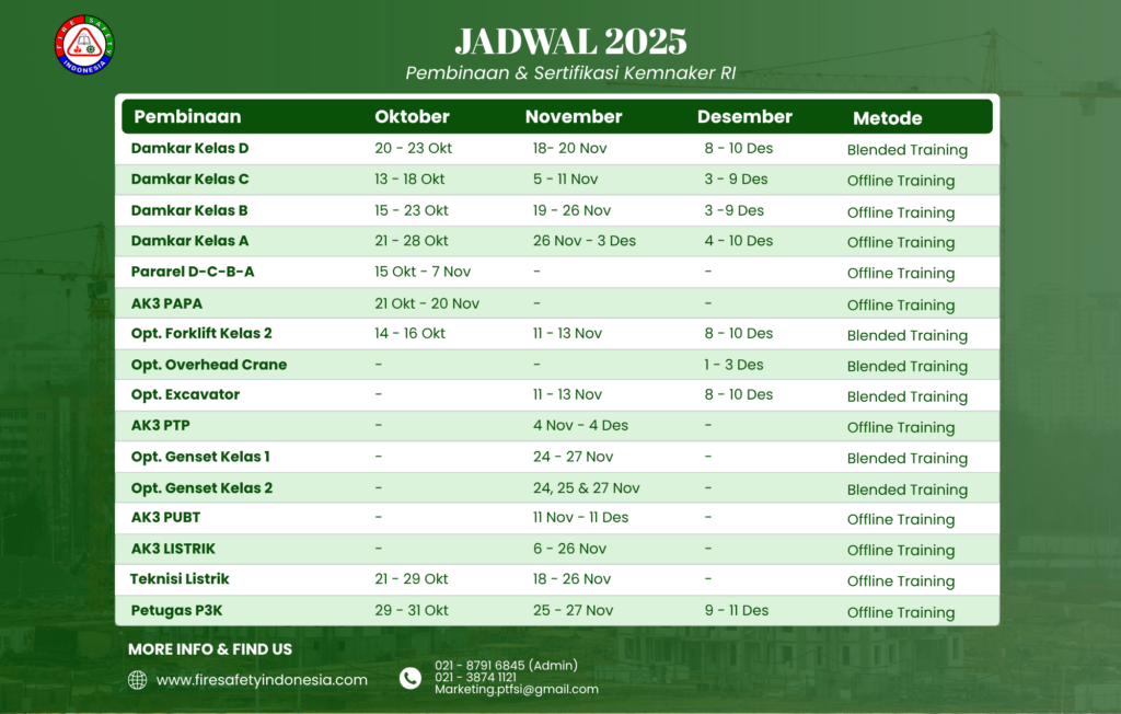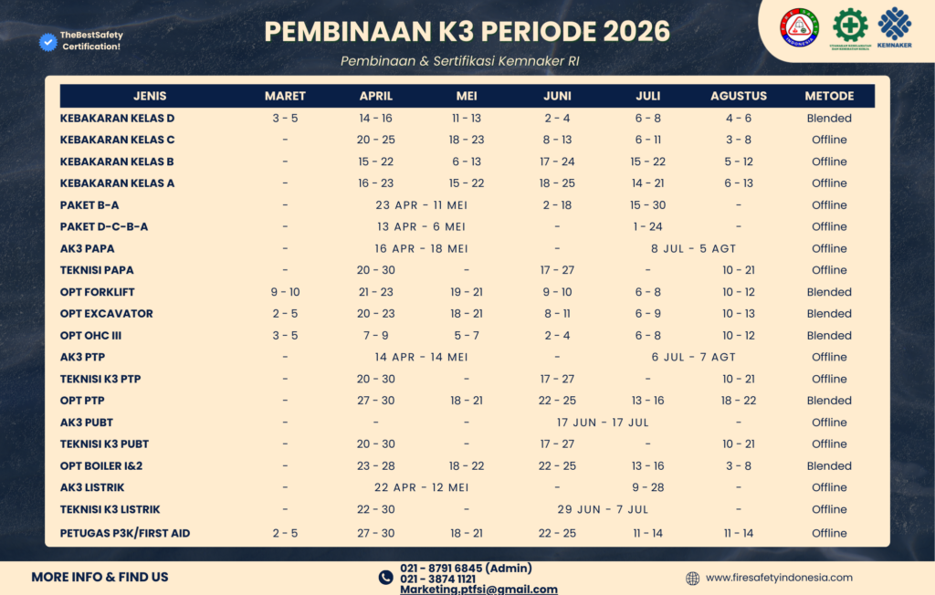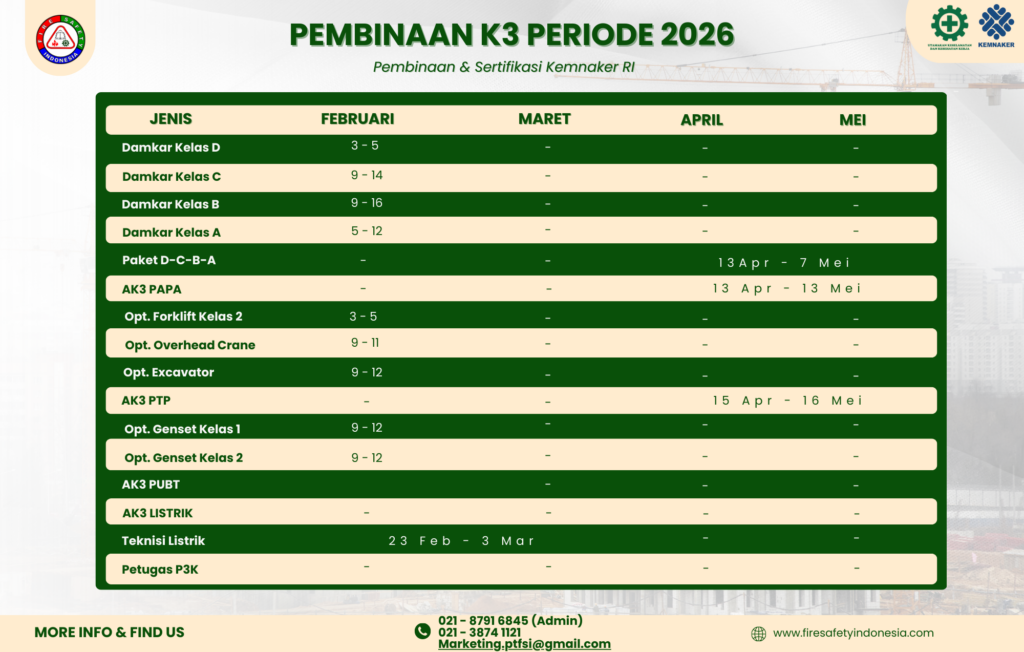 Kumpulan dokumentasi pelatihan yang ada di PT. Fire Safety Indonesia (FSI). Banyak pelatihan yang ada di kami. Seperti Ahli K3 PAPA, Ahli K3 PTP, Ahli K3 PUBT, Ahli K3 Listrik, Ahli K3 Kebakaran Kelas D, Kebakaran Kelas C, Kebakaran Kelas B, Kebakaran Kelas A, Operator Forklift, Operator Overhead Crane, dan lain-lain.